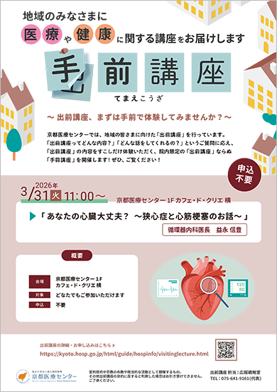 | 目的 | 地域の方と京都医療センターの医師との交流を深め、医療や健康への興味を持っていただくと共に、より開かれた病院を実現するため |