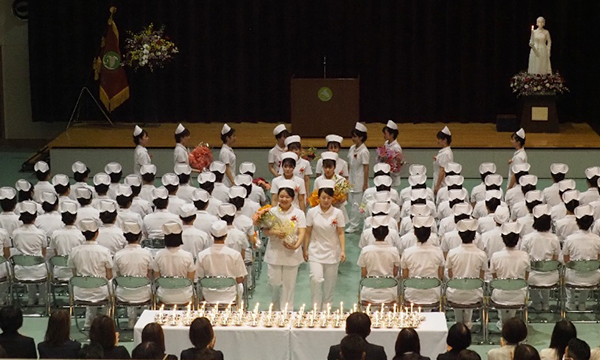 看護学科1年生です。戴帽式は、看護師の象徴であるナースキャップを戴き、看護の心をキャンドルに灯して看護師になるための気持ちを誓う式典です。